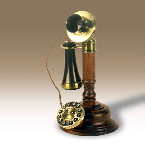 This is a desk telephone with a classical and retro design. It features a wooden stand with a smooth finish. The golden parts add a touch of luxuriousness to this telephone.