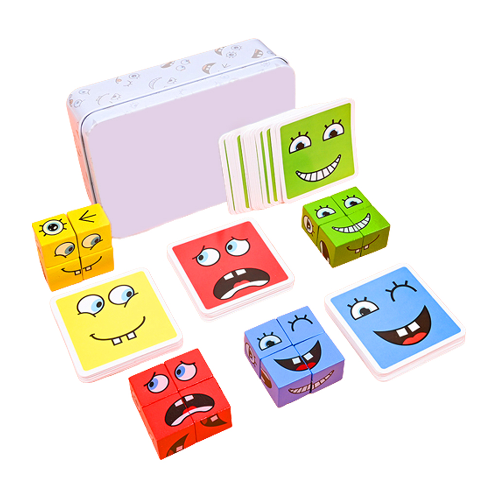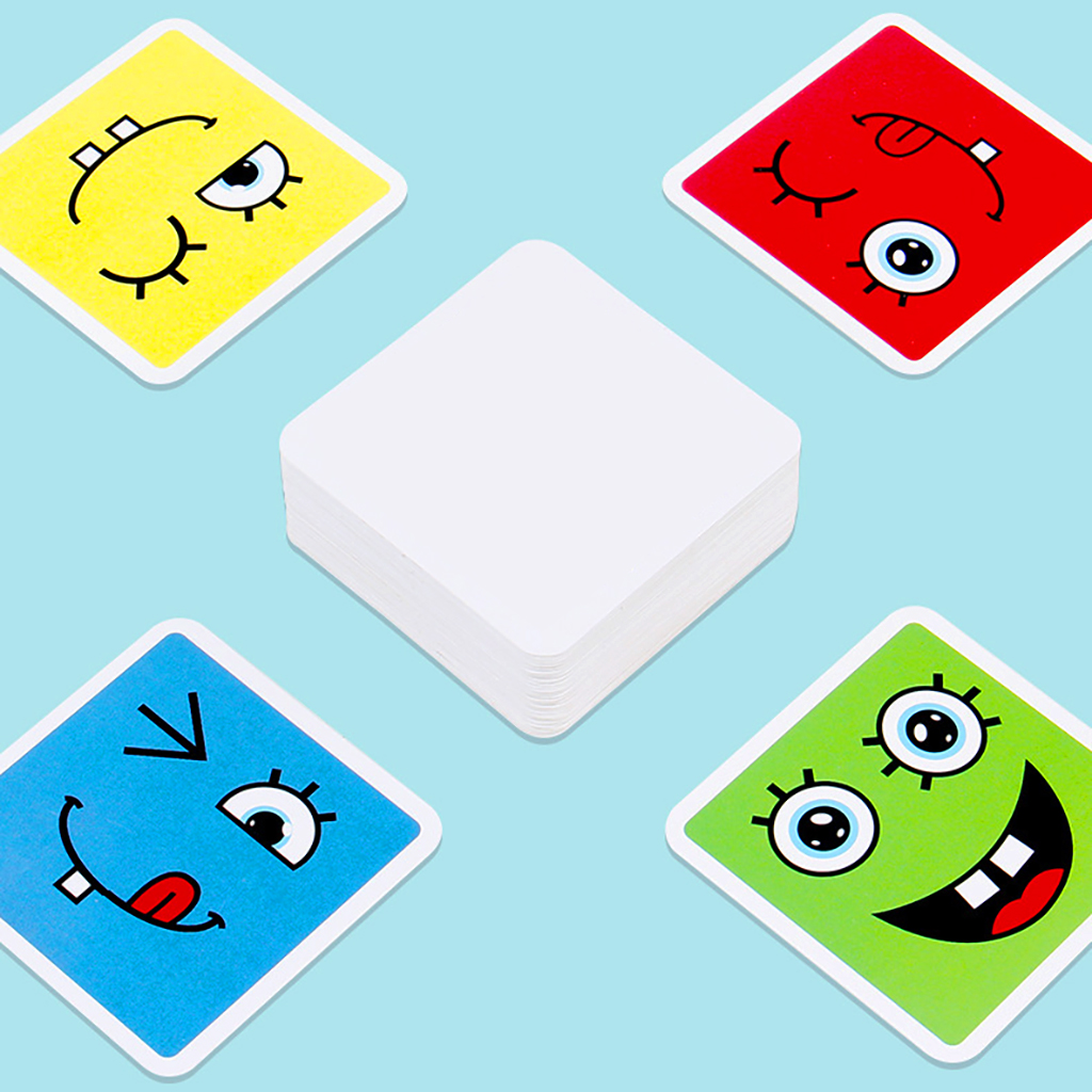 64 challenge cards with changing faces, 16 of each color, with rich and interesting expressions