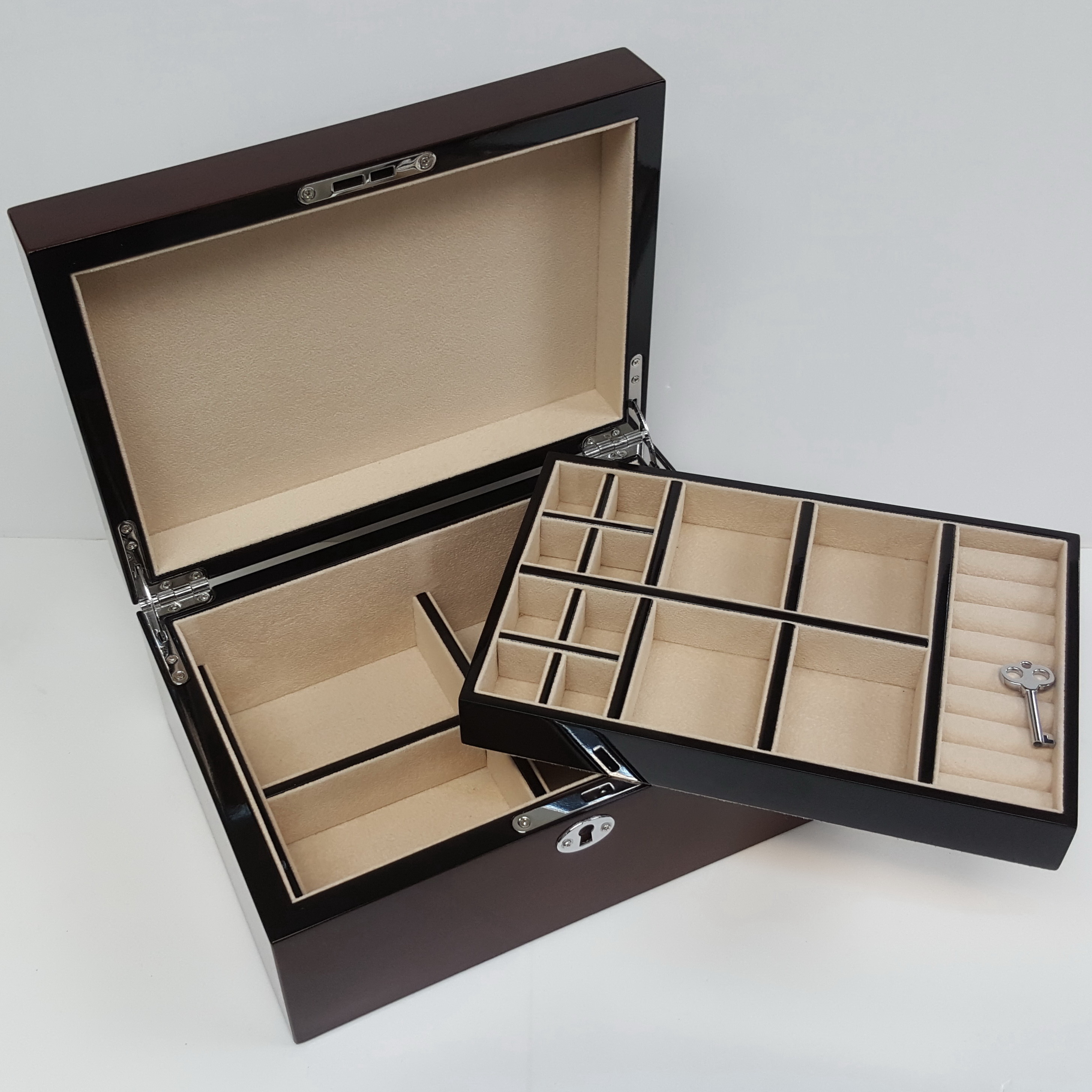 Elegant wooden jewellery box in high gloss finish; Double-deck. With lock.