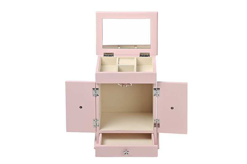 Our wooden jewelry box—A perfect blend of elegant aesthetics and practical functionality, designed for those who value both quality and style. The exterior is made from premium solid wood, offering exceptional durability and stability, meticulously polished and coated with high-gloss varnish to reveal a warm sheen and smooth texture. The interior is lined with soft velvet and suede materials, providing a gentle touch that protects jewelry from scratches while keeping them in pristine condition. The box is equipped with a crystal-clear mirror on the top for ease of daily wear and styling, multiple functional compartments for organizing rings, earrings, necklaces, and bracelets, and a durable hook for hanging delicate pieces. Side-opening double doors and a bottom drawer maximize storage efficiency, while high-quality metal hinges and hardware ensure long-lasting performance and structural integrity.