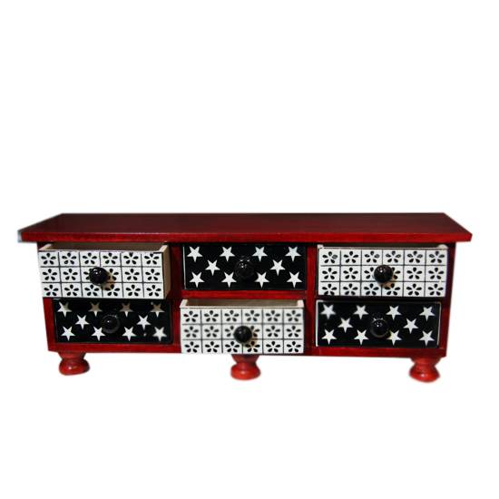 This is a wooden kitchen box. The kitchen box has a rectangular shape and a regular arrangement of 6 boxes. The surfaces of the drawer boxes are all painted with black and white patterns.