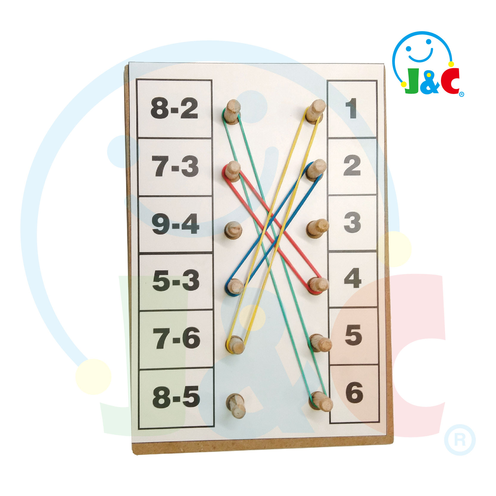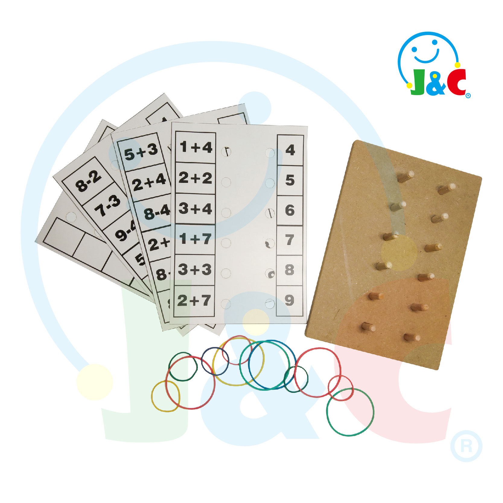 Children check the math question, then use different color of rubber bands to connect the correct answer, or create new questions on the blank card for each other.
