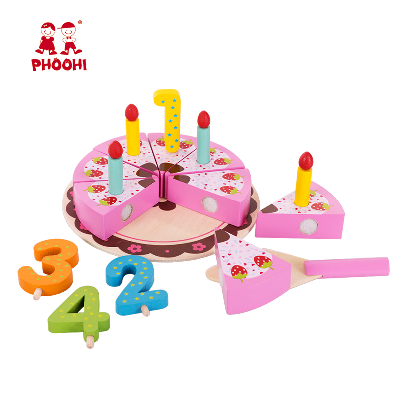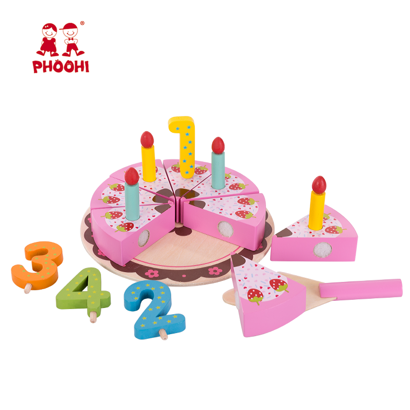 Children pretend cutting food set toy pink kids wooden play cake with candles