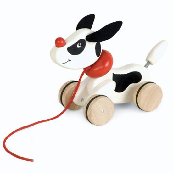 This wooden puppy has a pull-along quality for maximum entertaining level. There are smooth wheels letting the children pull the puppy around pleasantly. The wooden ride-on puppy is laminated for maximum persistence.
