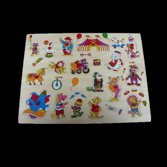 This peg puzzle features a wooden board in a rectangular shape. It is inspired by the theme of the circus. The colorful pieces stimulate your children's visual development.