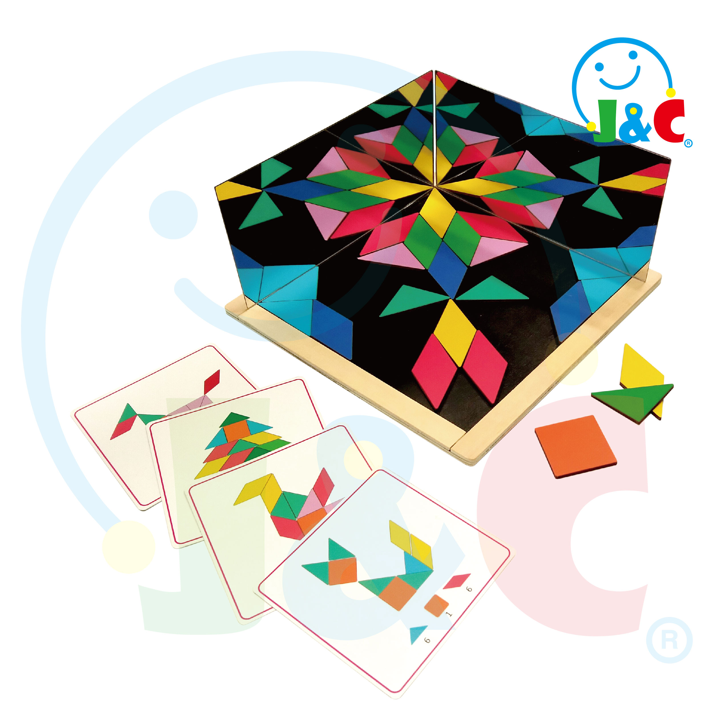 As a kaleidoscope, there are 2 mirror stand at the edge of the puzzle board, when children put puzzle piece in the tray, the pattern will visit on mirror, children can change with different patterns to get different visions.