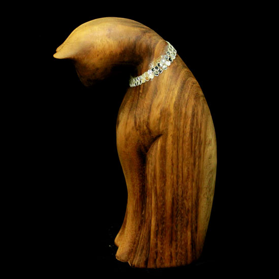 Shown here is a beautiful sculpture designed in an abstract cat shape. The natural wooden grain looks exceptionally attractive with a lustrous finish. Little mirrors are paved on the cat’s neck as a delicate collar.