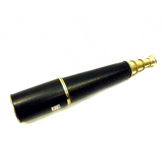 Displayed here is a telescope in a black color. It is made of brass and wood with fine finishing. The solid construction makes it stand above the rest.