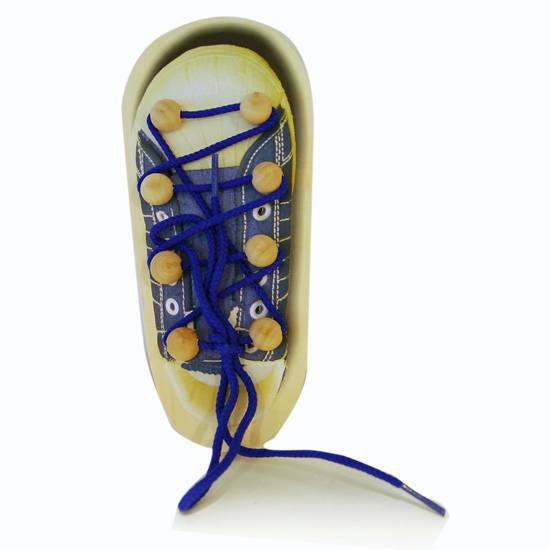 This featured item is a toy shoe that is made of wood. This product is further decorated with a shoelace, making it a realistic depiction of a shoe. This item is a great toy for your children.
