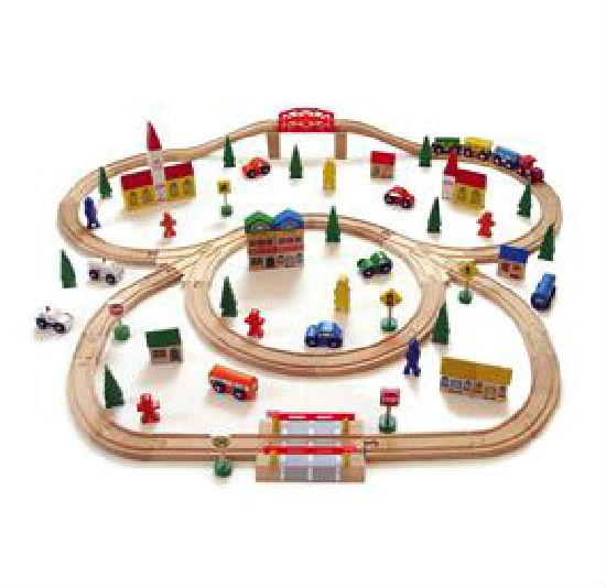 Set includes:(18) Large Curves, (2) Small Curves, (4) 2" Straights, (2) 6" Straights, (2) Riser Blocks, (2) Hills, (1) 12 Piece Train and Vehicles set as pictured, (1) People and Trees Set as pictured, (1) Buildings and Houses set as pictured, (1) Wooden 6" Yellow Span Bridge, (6) Traffic Signs, (2) 3-into-1 Switch Junctions, (1) Railroad Crossing Track.