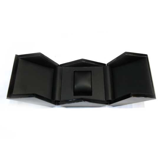This watch box features an elegant tri-fold design and a black wooden construction. It is perfect for protecting and displaying a single timepiece. This exquisite watch box is a must-have for passionate watch collectors.