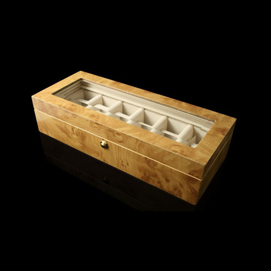 This box with multiple compartments is perfect for all watch collectors. The natural wooden finish in light brown flaunts a rustic touch. You can appreciate your precious watches from the window cover.