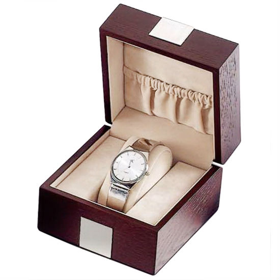 Wooden watch box laminated with veneer and decorated with stainless steel. Various sizes and colors are available.