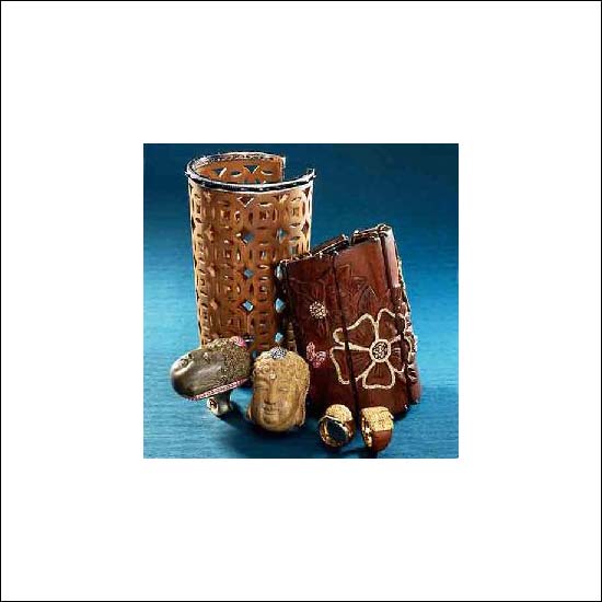 Wooden cuffs in ancient motifs, flowers and butterflies set with diamonds rubies, sapphires.