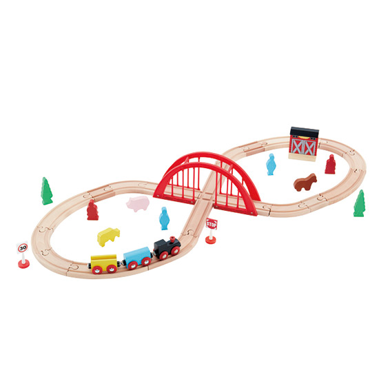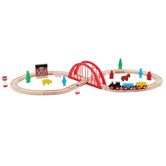 includes 3 train vehicles, bridge, wooden animals, figures, traffic sign and house. total piece is 35 pcs