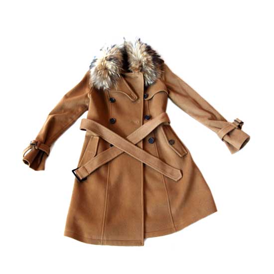 This camel-toned overcoat goes well with a wide range of outfits. It features a double-breast front closure with six round matching buttons. A matching belt is included for defining the waistline.