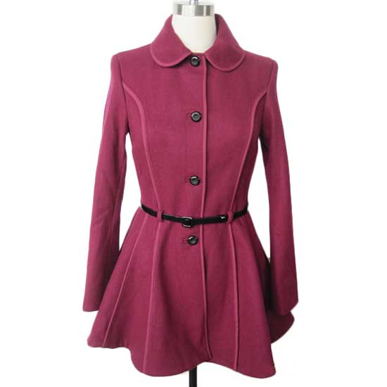This is a women's wool coat that comes in a fashionable purple color. The round collar and the straight row of front buttons bring out the elegance of the lady. This coat is embellished with a thin belt for a stylish touch.