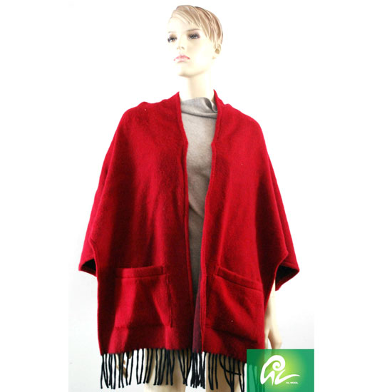 Presented is a poncho with a total wool composition for extra warmth and comfort. The fierce red makes a bold fashion statement. The fringed details add a touch of style for the look.