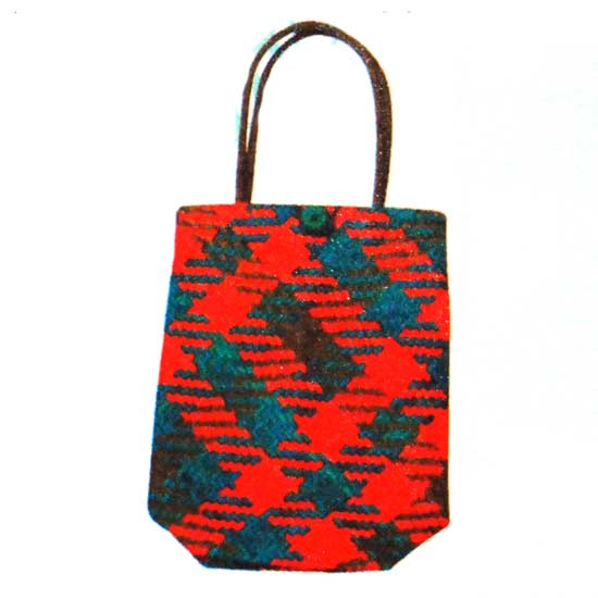 The bag features a vivid red and green construction. The checkered and striped patterns add a decorative touch. This bag makes an excellent fashion accessory item.