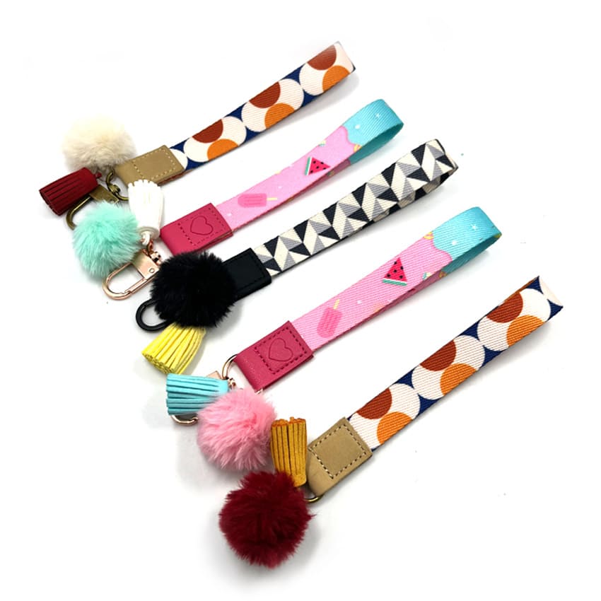 Wristlet Strap Lanyard Keychain for Men and Women utilizes thick and dense polyester with a special weave for a cotton-like feel which is soft and comfortable to wear on your wrist all day. Any vibrant color can be faithfully translated onto the lanyard with heat transfer printing process. The metal clip that holds your essentials is solid and durable for everyday use. The faux fur ball and suede tassel make it more fun to this simple but fashionable hand wrist lanyard keychain holder. Hang it from your pocket or stuff it in your backpack or purse. It is perfect for office, school, home, outdoor, travel and any occasion you need it. Send us your unique design, our finest craftsmen will create the quality lanyard wristets for you!