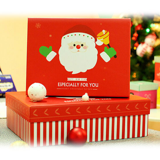 This Xmas gift box comes with an all-red lid and a striped body. The front is printed with a Santa Claus image for a festive look. The just-fit lid helps keep your contents inside securely in place.