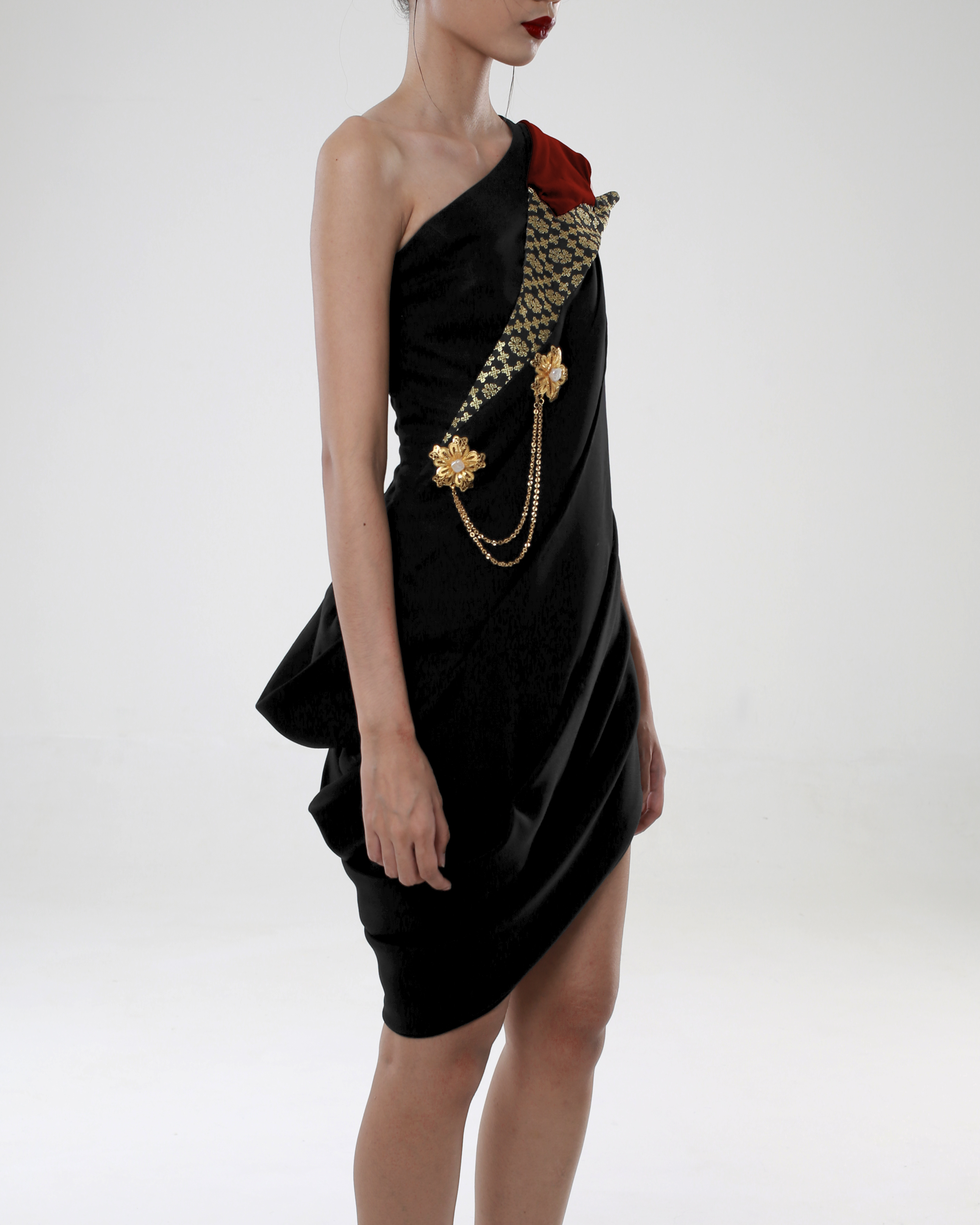 Asymmetrical draped suit dress with deconstructed tailoring, this one-shoulder silhouette features sculptural draping and a touch of gold ethnic Indonesian fabric for a refined yet striking finish