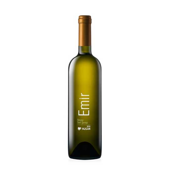 Displayed is a bottle of Turkish wine. Made from Emir grapes, this white wine has a light straw color and a fruity nose. This high quality white wine is ideal to go with white meats, seafood dishes and cheeses.