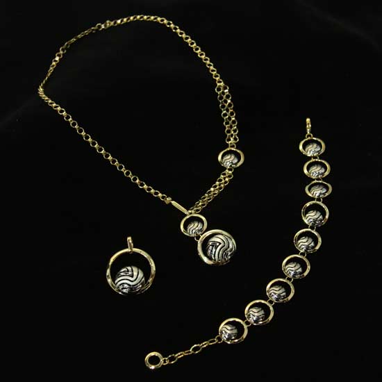 The fabulous jewelry set comes with a bracelet, a necklace and a pendant. All items feature a hollow design with a golden ring framing a solid silvery circle carved in wave-like patterns. The necklace is finely polished to give high luster. The elegant yet stylish design matches youthful attire.