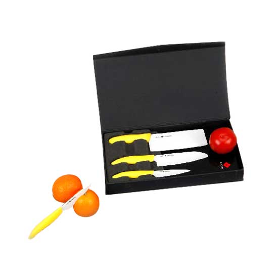 This is a set of kitchen knives that features 3 knives packaged in a quality gift box. Each piece comes with a bright yellow handle and a white blade for a neat and fresh appearance. The sharp ceramic knife blade offers an efficient cutting experience.