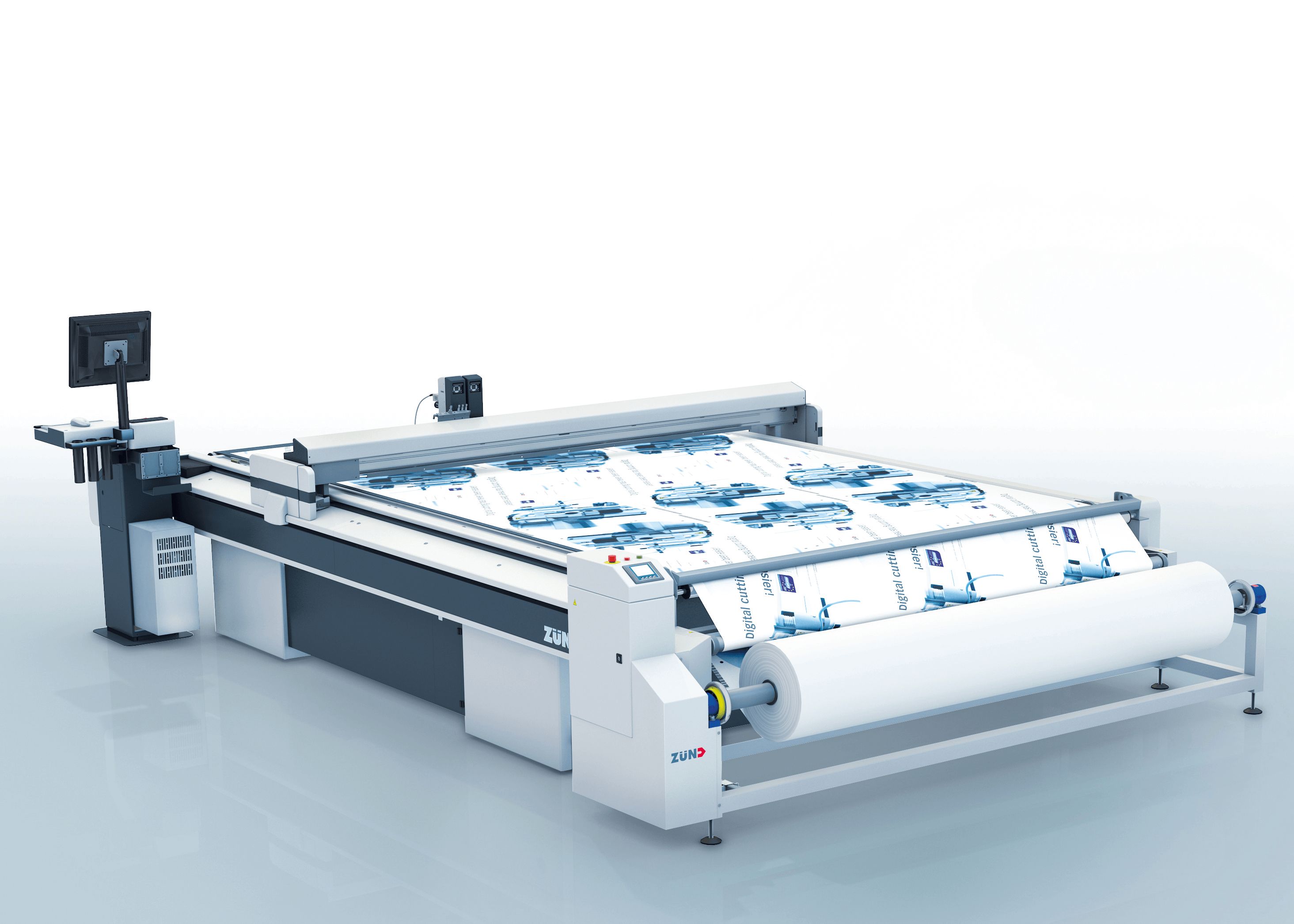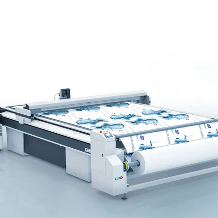 The robust design of the Zünd Center Winder enables processing rolls up to a weight of 100 kg/220 lbs. The well-designed mechanics ensure consistent material tension. Even challenging textile materials can be fed onto the cutting system free of wrinkles and tension. The driven center winder can both unwind and rewind rolled materials. For lighter rolls weighing up to 40 kg/90 lbs, the dancer bar can be used as a passive roll-off unit.