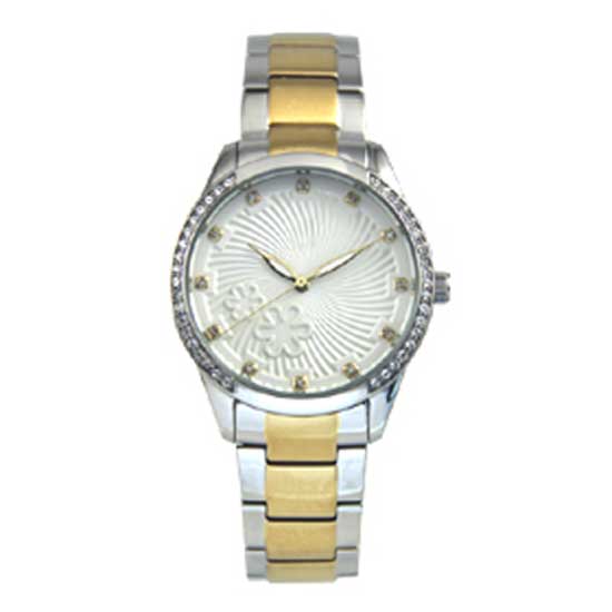 This analog watch features spiral and floral patterns on the round white dial for an exquisite look. The shiny decorations highlight the bezel easily. This tasteful wristwatch is completed with a silver and golden hued band.