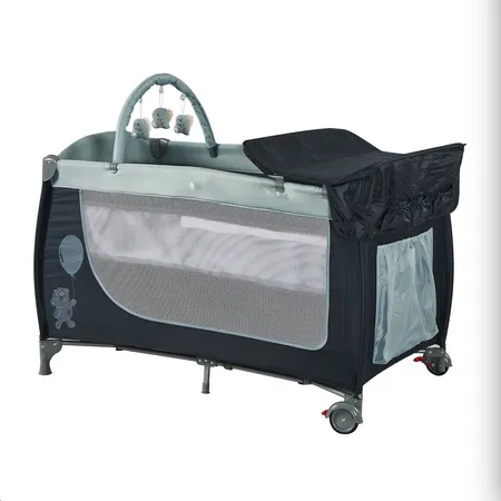 2 braked wheels, toy bag, zipper hole, second layer with zipper, changing table, single toy bar with 3 toys. PASS EN716.