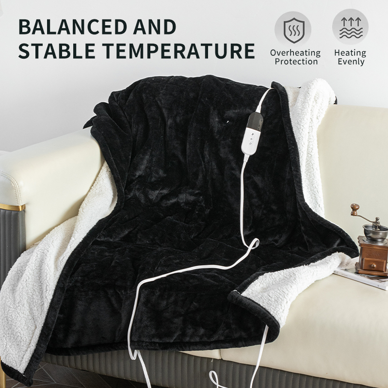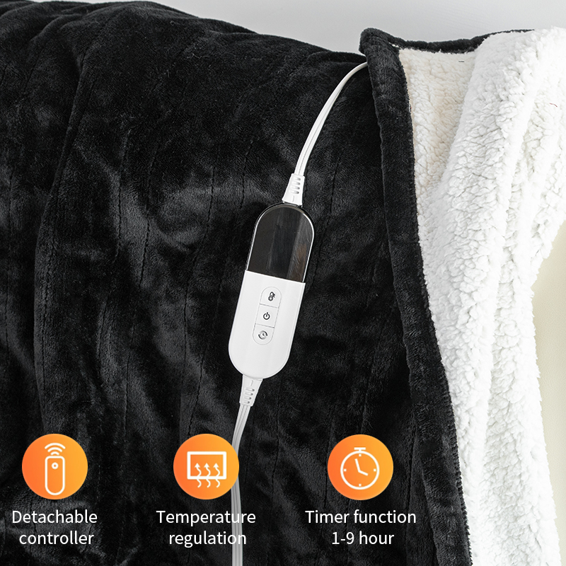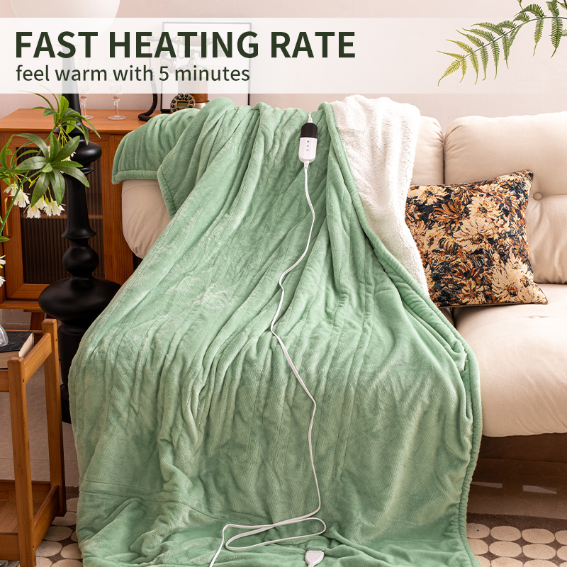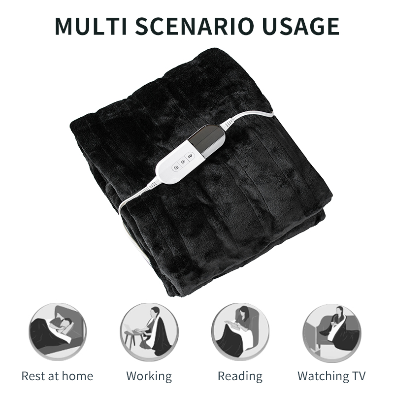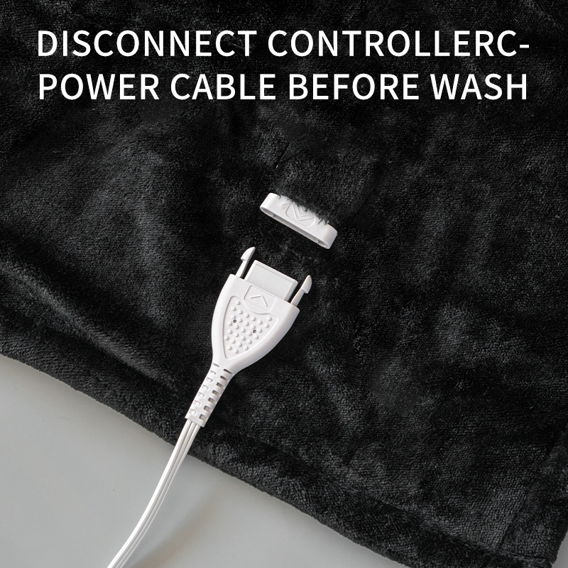 Material: Super comfortable flannel and velvet Voltage: 120v, 60Hz Power: 125W4 Heating setting with LED indicator: Hi-med-low-warm-up automatically shuts down after 4 hours due to removable controller for cleaning fast heating and overheat protection (PTC + NTC heating system) SO13485 / BSCI/UL&cUL/FCC/CP65 certification