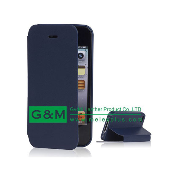 Displayed is an iPhone case featuring a blue finish. It can be folded as a stand to tilt up the phone screen at the most comfortable viewing angle. It protects your phone against scratches and in falls.