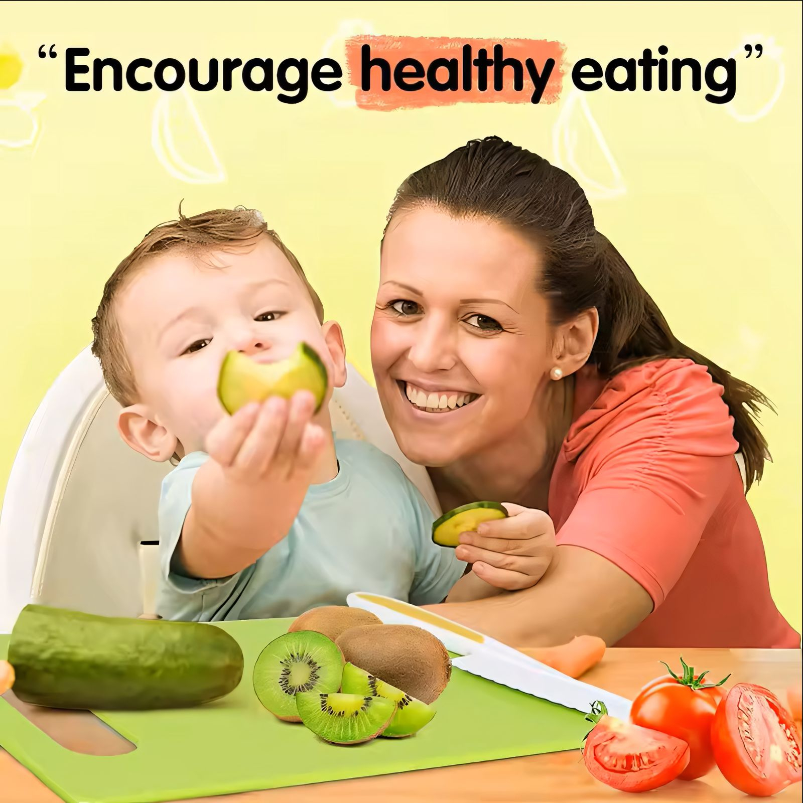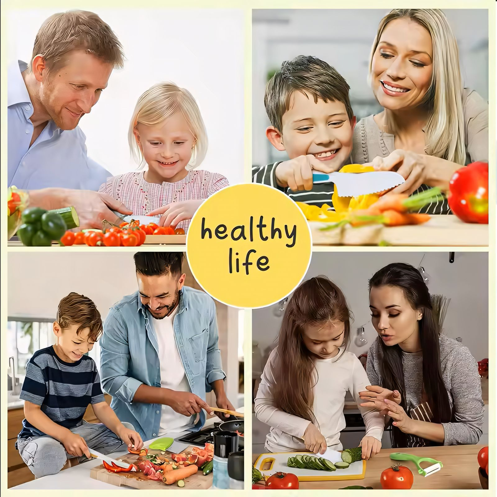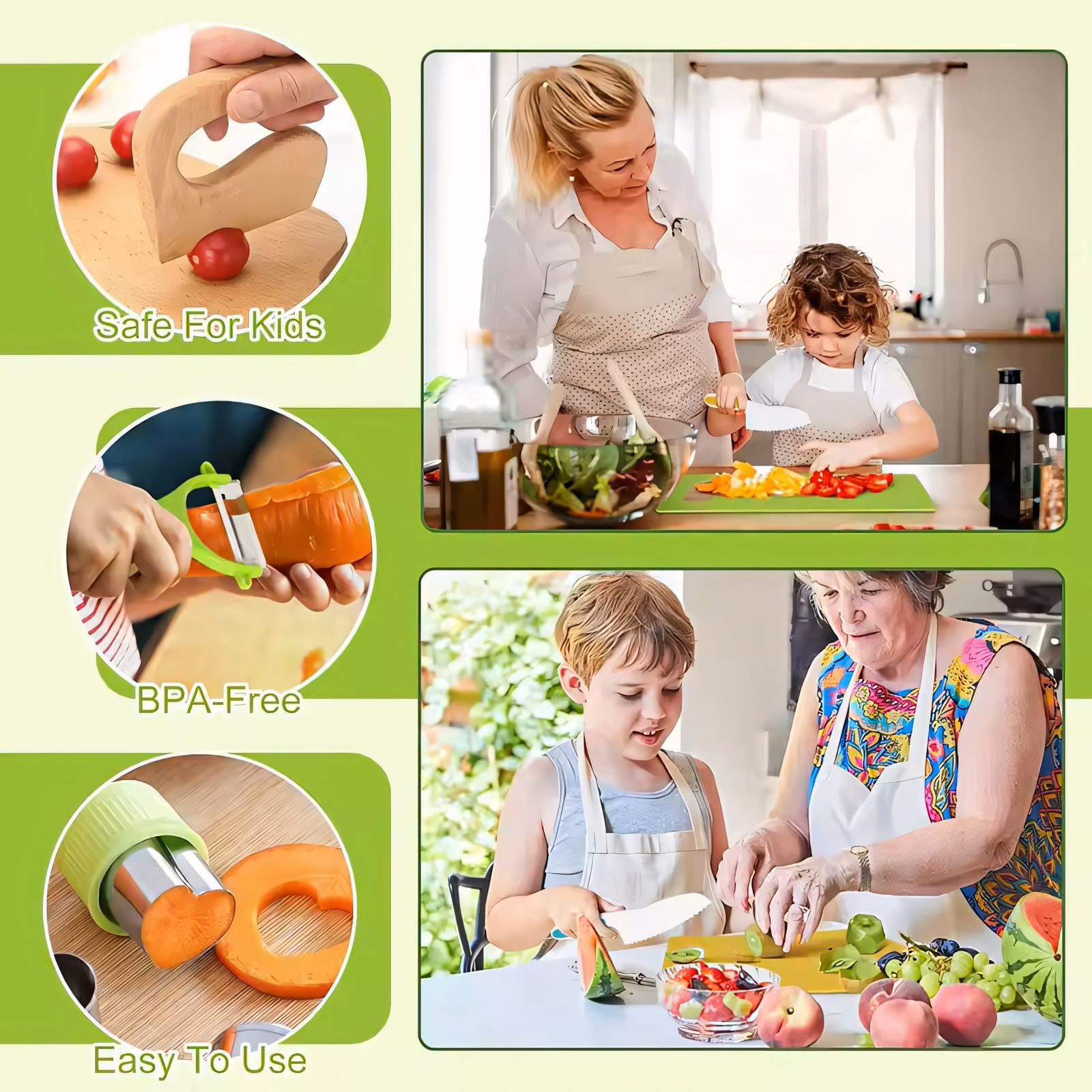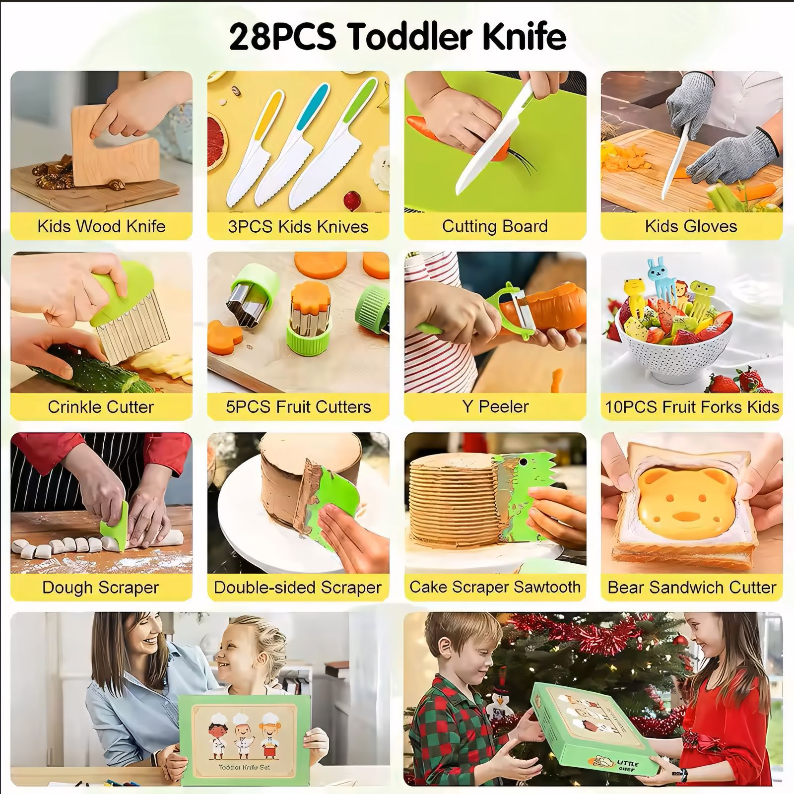 | Shapes | All Kinds of kits real cooking set Our toddler knife set includes 1 piece wooden kids knife, 3 pieces different size / color serrated edges kids knives, 1 * children kitchen gloves, 1 pieces potato slicers knife, 5 * fruit cutters shapes (Split Design), 1 * Y peeler, 1 * bear sandwich cutter, 3 * cake scrapers, 10 * kids fruit fork, 1 * cutting board and 1 * gift box. | Fits For | Toddler kids loves to help in the kitchen. Children can use these tools for heuristic play, pretend play and open-ended play, increase children's hands-on ability, helps children develop motricity and autonomy, bringing your child a happy and interesting using experience. Perfect kitchen set for encouraging children to learn more about proper knife skills and safety in the kitchen. |