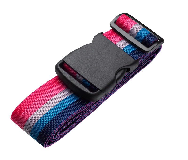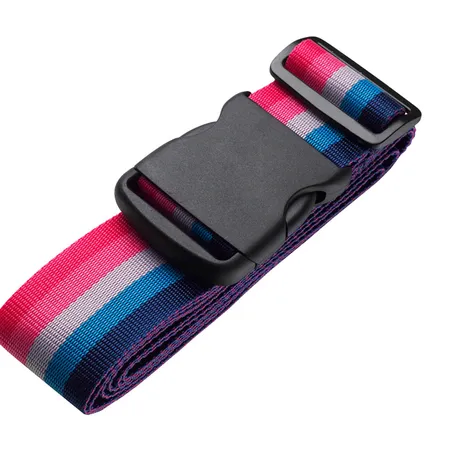Pictured here is a luggage strap with a quick-released buckle. This adjustable strap is designed to fit all suitcases and can be used to keep it shut. Coming in a bright color, this luggage strap makes finding your luggage in crowded baggage areas a lot easier.