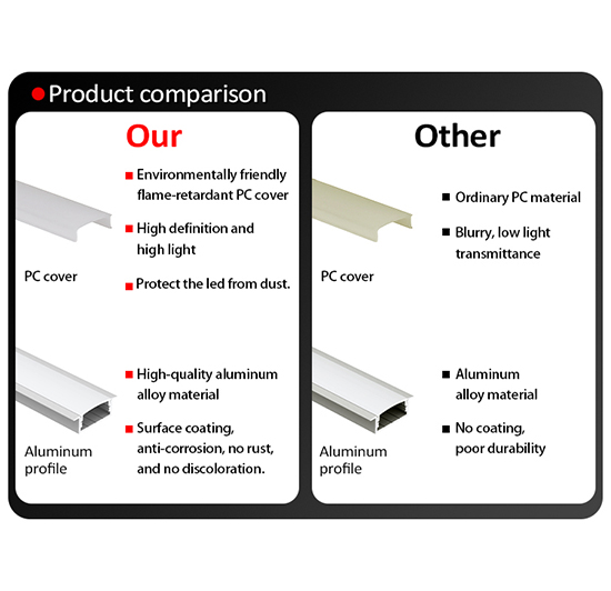 1. Aluminum profile: It's made of high quality aluminum alloy 6063-T5 material, surface coating, anti-corrosion, no rust and no discoloration.