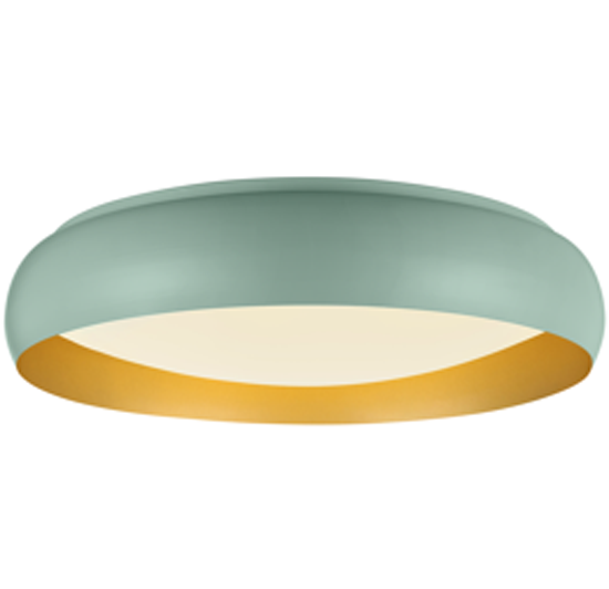 This is a round ceiling light. The upper lampshade is light green, and the bottom features a warm - brown frame with wood grain texture. With a round shape, it emits soft and comfortable light when lit.