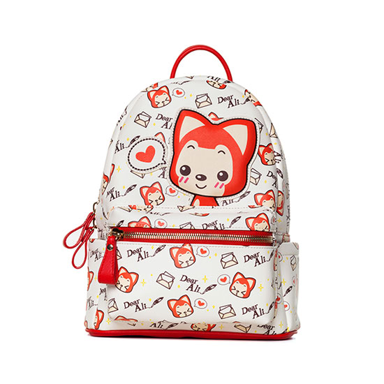 This is a licensing service for Ali's backpack. The backpack is printed with a large Ali the Fox image and love letter patterns. The backpack is excellent for leisurely and academic purposes.