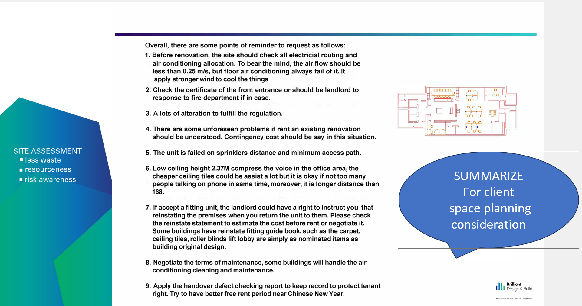 A robust fitting out initiative begins with a Site Assessment, which explores the spatial layout and structural features of your facility. This evaluation identifies opportunities to minimize surplus material usage, optimize daylight, and reuse existing E & M system with minor alteration during the construction phase. Such proactive measures help decrease environmental impact, enhance resourcefulness, and foster risk awareness across internal teams.
