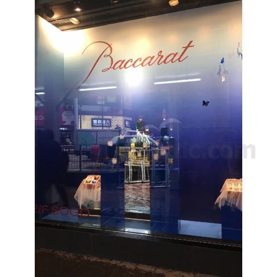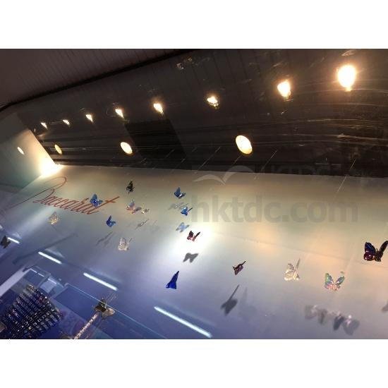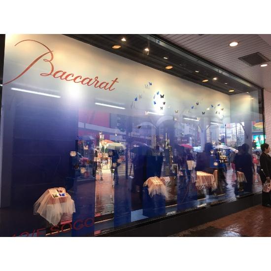 Baccarat window display with flying butterflies brings out spring mood and decorate with blue and stainless steel mirror finished totems to display the luxary products. Background in blue to make outstanding of Baccarat red.