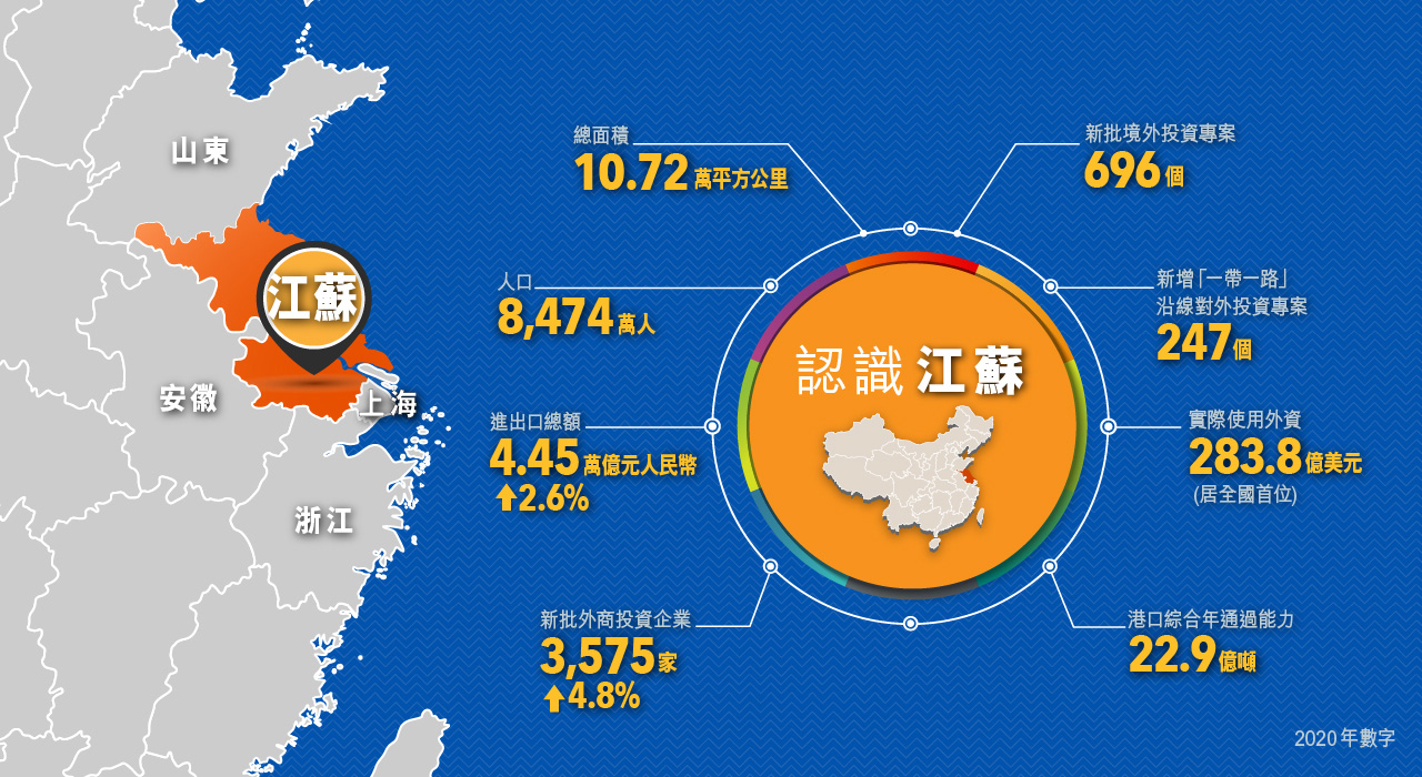 2020年,江蘇開放型經濟呈現難中趨穩、穩中提質的發展態勢。穩外貿穩外資成效顯著,全省完成進出口總額4.45萬億元,同比增長2.6%。全年新批外商投資企業3,575家,比上年增長4.8%;實際使用外資283.8億美元、居全國首位。全年新批境外投資專案696個,中方協定投資額57.4億美元。