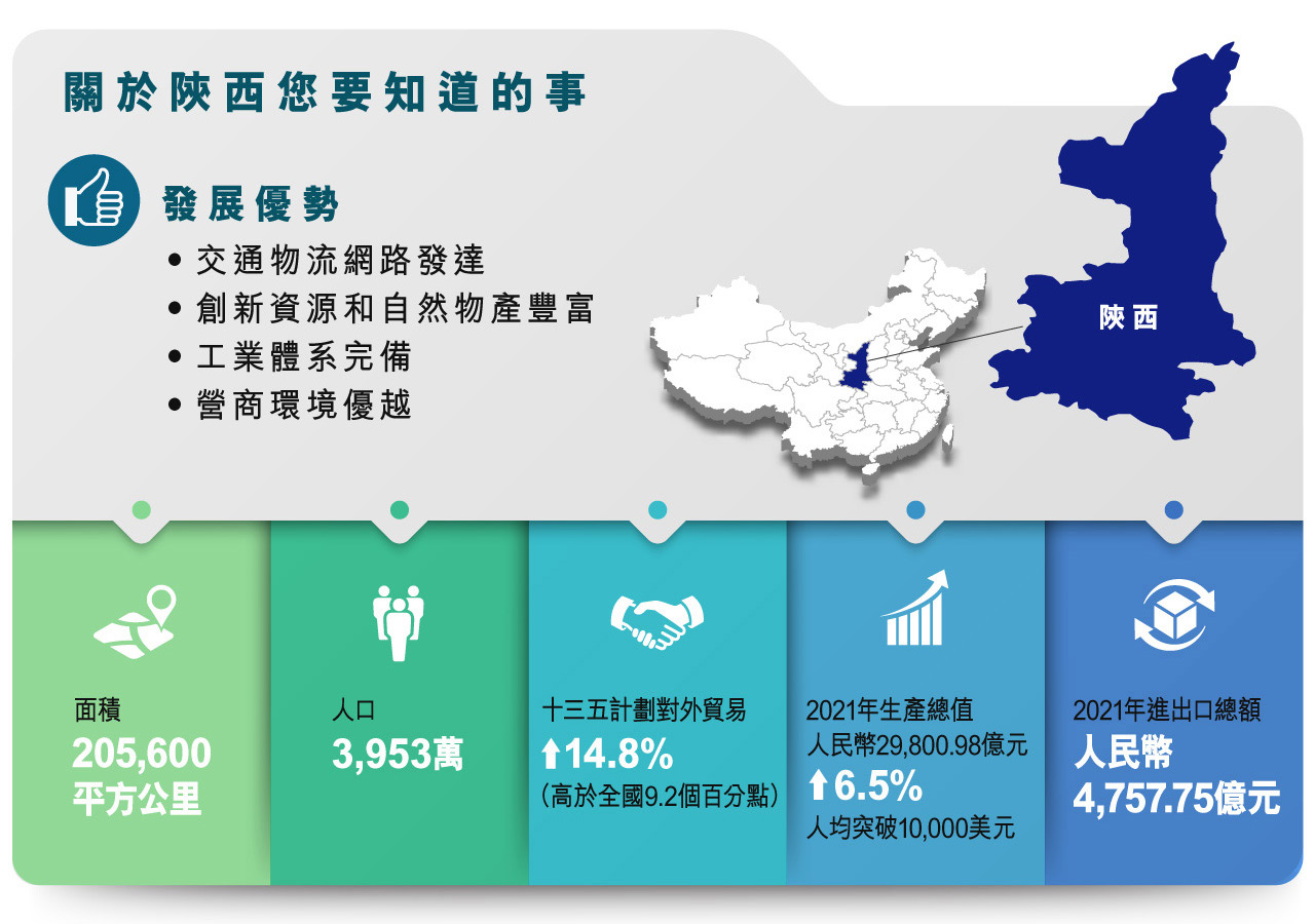 陝西區位優勢明顯,位於中國地理中心,承東啟西、聯通南北。西安咸陽國際機場是全國八大樞紐機場之一,兩小時航程就覆蓋全國70%的區域。疫情前已開通航線370條,其中國際航線88條,運營全貨運航線20條。陝西擁有全國最大內陸港 — 西安國際港務區,其運營的中歐班列「長安號」至今已有15條國際線路,覆蓋輻射歐亞大陸44個國家和地區。截至2021年11月,「長安號」開行量突破3,800列,開行量、貨運量、重箱率等各項指標穩居全國第一,成為中歐班列高質量發展的典範。