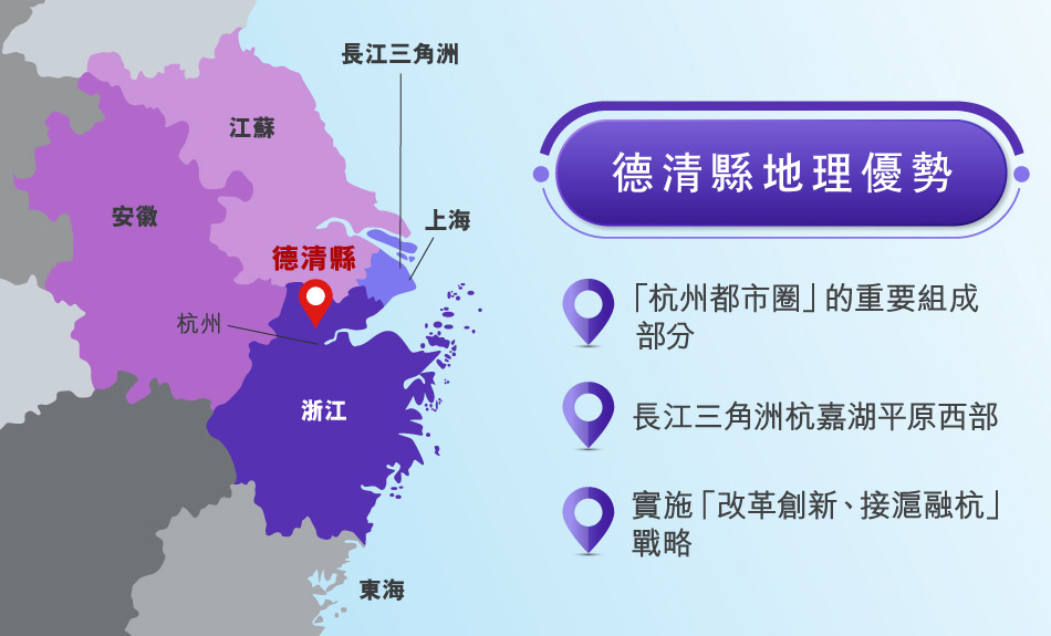 德清縣具備獨特地區優勢,為中國內地「杭州都市圈」的重要組成部分。縣內設有多個產業園區,加上完善配套服務,多個重點高端產業茁壯成長