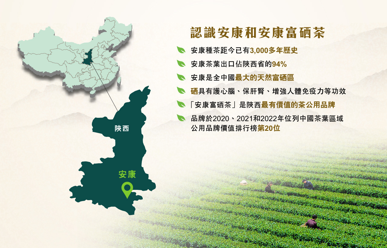 安康位於陝西省東南部,地處南北生態氣候過渡帶,秦嶺巴山橫亙南北、千里漢江流經西東,是中國南方的北方、北方的江南。安康是南水北調中線工程水源涵養區,秦巴山水好,茶因水而生津、水因茶而靈秀;安康是全國最大的天然富硒區,被譽為「世界硒源、中國硒谷」,被專家一致評價為「優質、環保、安全」的富硒區域。安康坐擁獨特的生態地理優勢,為茶葉提供了理想的生長環境,是地球上同緯度最適合茶樹生長的地方,是中國最北方的生態茶區和全國富硒茶最好的產區。